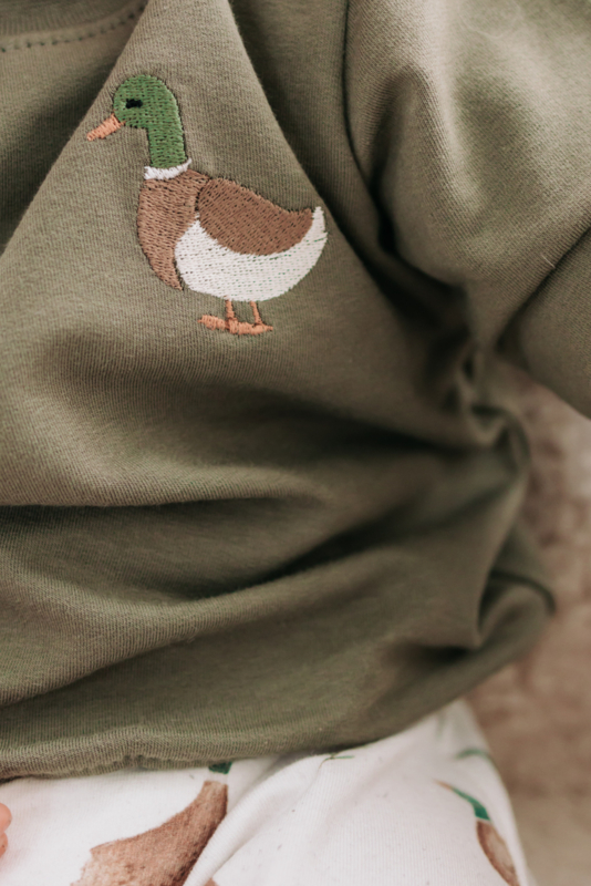 Kleine kleertjes met een groot knuffelgehalte – dat is precies wat deze olijfgroene sweater met eendje uitstraalt. De zachte trui is speciaal ontworpen voor kindjes van maat 56 t/m 104.