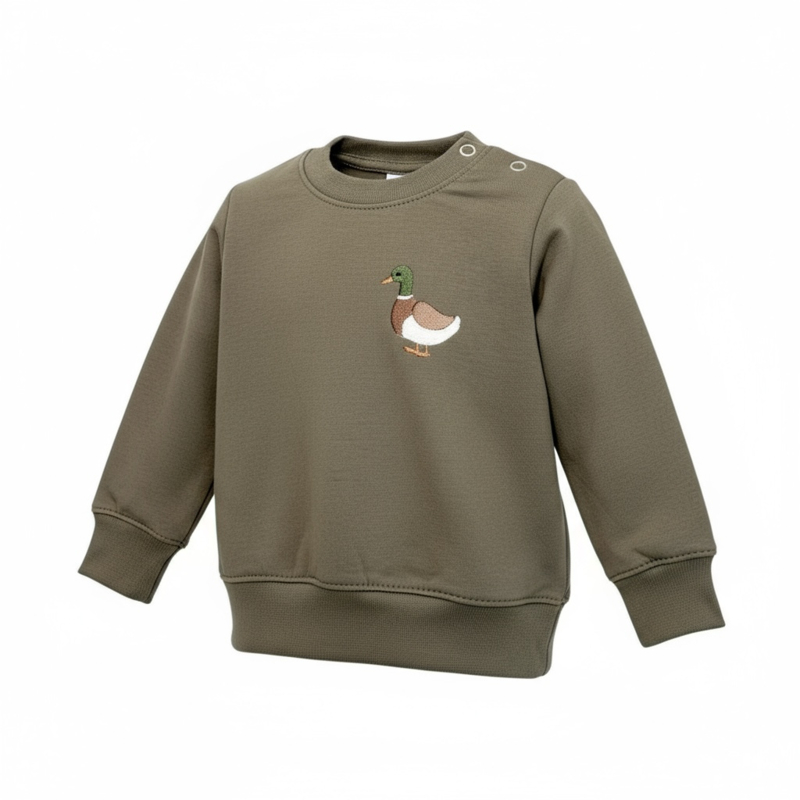 Artikelnummer: KL.061025001Olijfgroene sweater met geborduurd eendje