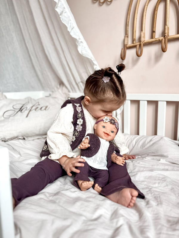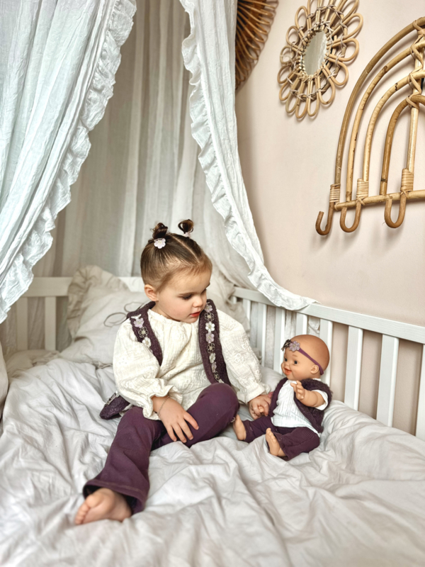 Giletje - Bloom PurpleDit prachtige giletje in teddy look met mooie bloemenband met gouddraad maakt de outfit van je kleintje helemaal af! In een mooie paarse kleur perfect voor het najaar en de winter!