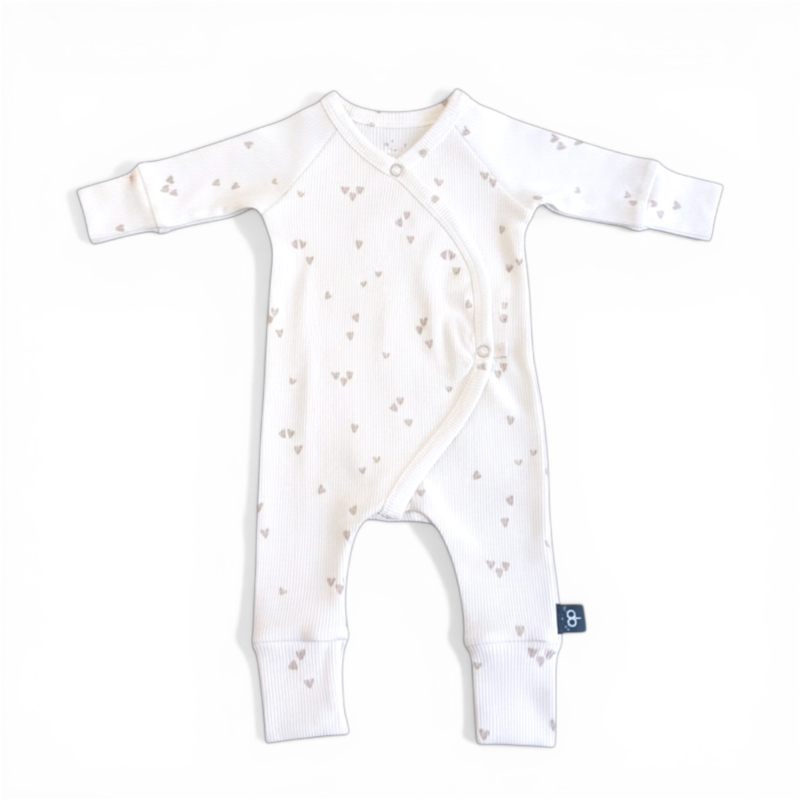 Boxpakje - Sweet Little HeartsEen lief boxpakje met zijsluiting, heel makkelijk aan en uit te trekken en met verschonen. Voorzien van offwhite ribstof met zandkleurige hartjes.