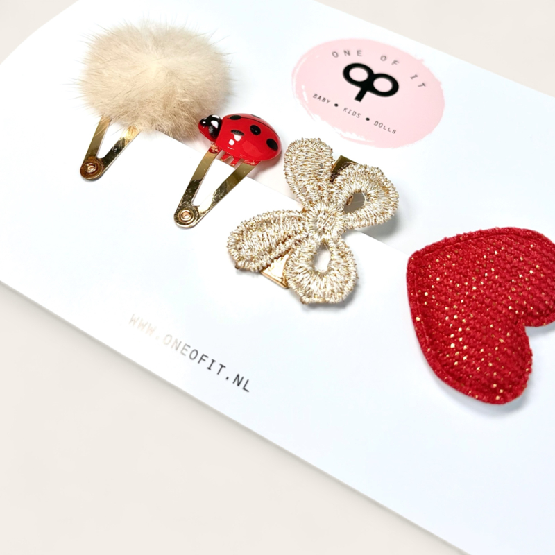 Een prachtig setje met natuurlijk een lieveheersbeestje, maar ook een pompom, een glitter strikje en een rood hartjes speldje met glittertjes erin. Perfect voor de mooie haartje van je kleintje!