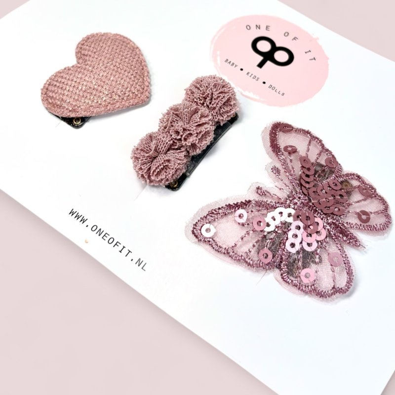 Maak de outfit van je kleintje af met deze prachtige haarspeldjes. In de mooie kleurtint mauve met pompoms, een hartje met een goud draadje erin verwerkt en een prachtige vlinder. Deze speldjes zakken niet uit, door de anti-slip functie van deze speldjes klik je ze vast aan de haartjes zodat het haar van je kleintje de hele dag perfect zit!