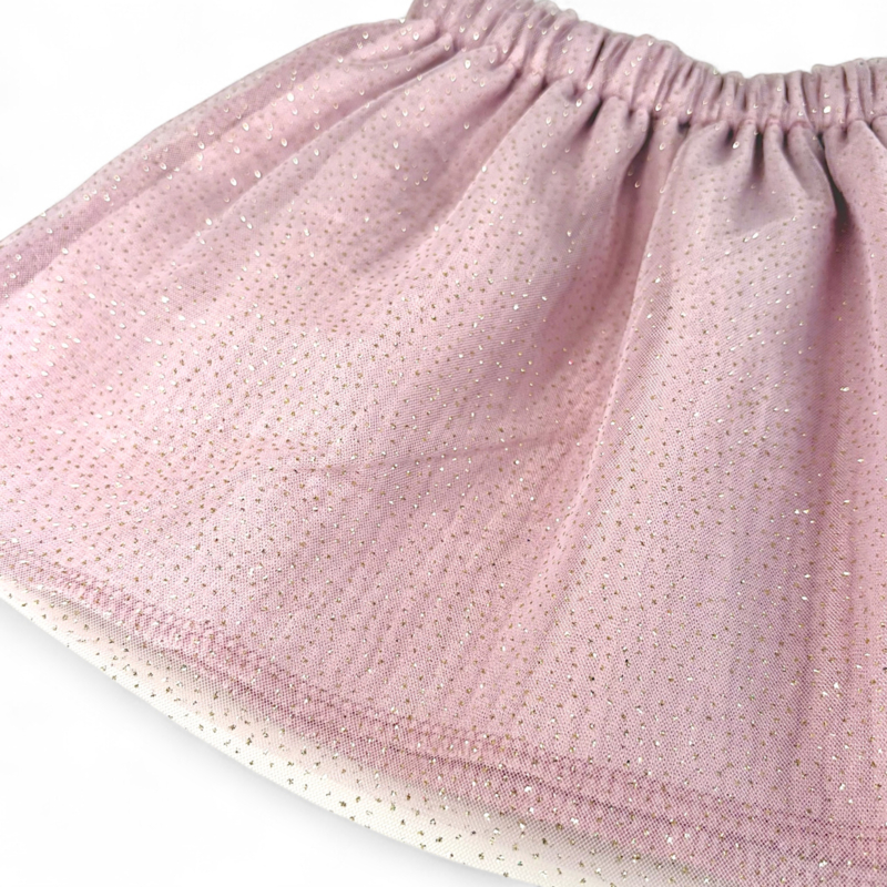 Laat je meisje stralen in prachtige vintage roze glitter rokje, een echte blikvanger voor het najaar en de feestdagen. Het rokje is gemaakt van vintage roze hydrofiele stof met een roze tule laagje met prachtige gouden glitters die schitteren bij elke beweging.