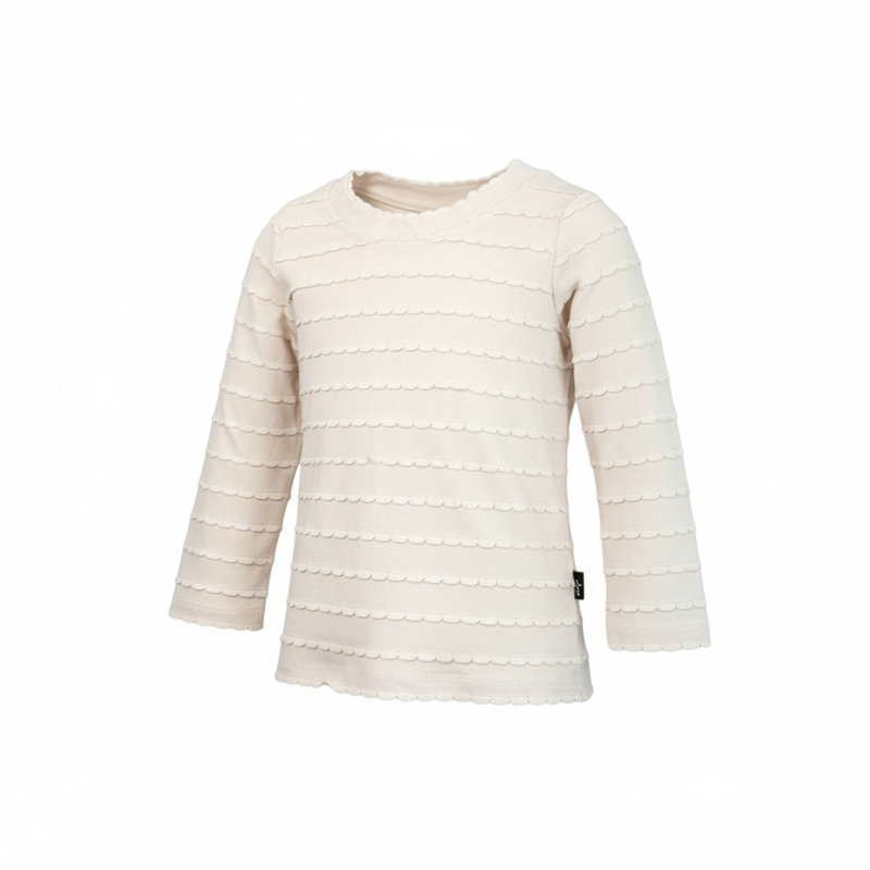 Het perfecte basic shirtje voor in je collectie. Met leuke schulp randjes voor net dat extra lieve effect. Kan onder al onze giletjes maar staat ook leuk als gewoon shirtje op een broekje of rokje.