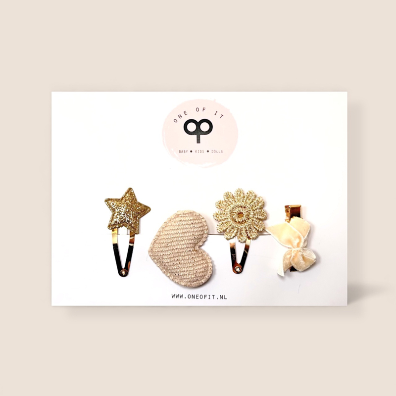 Maak de outfit van je kleintje af met deze prachtige haarspeldjes. Deze mix heeft een goud sterretje, een zandkleurige hartje met goud draad, een goud bloemetje en een velvet crème strikje.