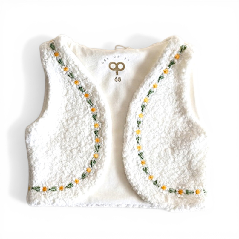Giletje - Daisy DreamDit prachtige giletje in wollen look met mooie madeliefjes met blaadjes maakt de outfit van je kleintje helemaal af! In een mooie basic offwhite kleur welke met vele outfits te combineren is.