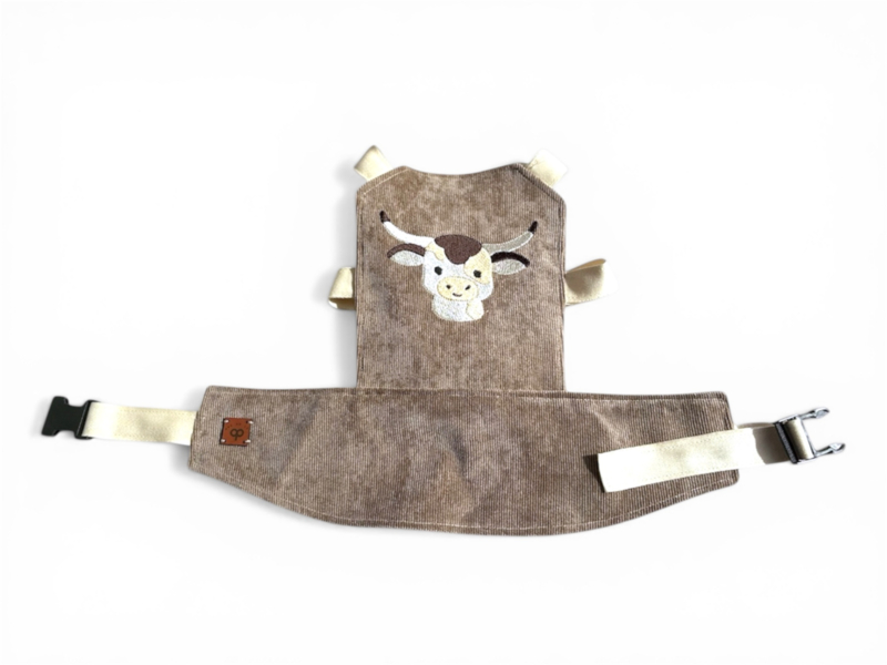 Laat je kindje goed zorgen voor zijn of haar popje – met deze stoere poppendraagzak, handgemaakt van bruine corduroy stof en afgewerkt met een uniek geborduurd koetje.