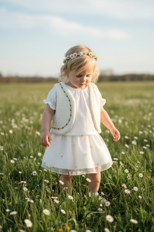 Dit prachtige giletje in wollen look met mooie madeliefjes met blaadjes maakt de outfit van je kleintje helemaal af! In een mooie basic offwhite kleur welke met vele outfits te combineren is.