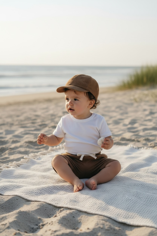 Maak de outfit van je kleintje af en bescherm tegen de zon met een stoer petje! Het petje is gemaakt van corduroy stof in een mooie kleur bruin en is te verstellen op maat. Geschikt voor kindjes van 3 tot 12 maanden.