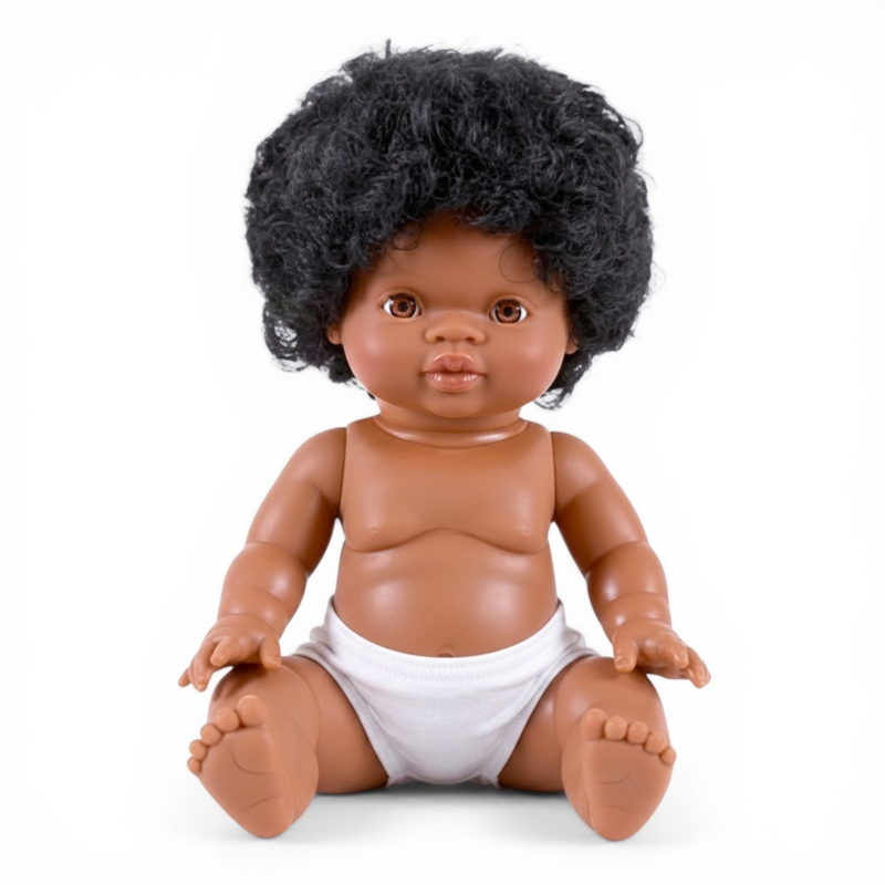 Paola Reina - Jahia - Donker kroesDe Paola reina poppen komen uit Spanje en zijn met de hand geschilderd. Met oog en liefde voor details. Het hoofdje en de armen en beentjes kunnen draaien.