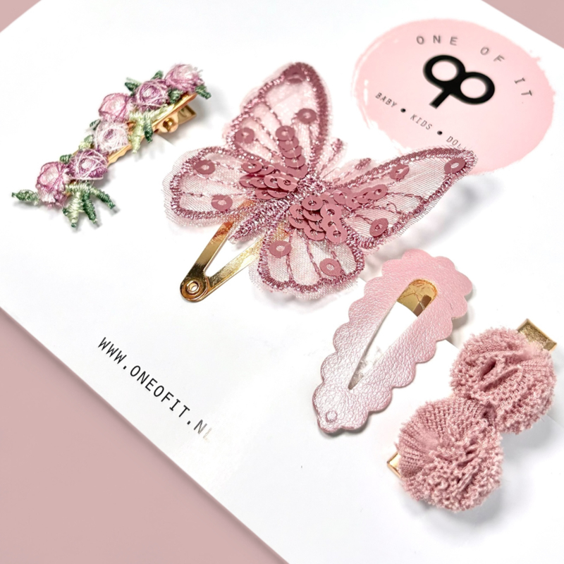 Maak de outfit van je kleintje af met deze prachtige haarspeldjes. Een lief vlindertje met pailletjes, mooie bloemetjes, een stirkje en een clipje met 2 pompoms, alles wat het outfitje van je kleintje nog extra nodig heeft!